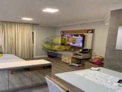 Sala de TV com rack, sala de jantar, piso em laminado, espelho, teto acabamento em gesso, iluminação em Led e lustre pendente.